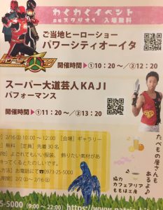 こんばんは!九州を中心に全国を回っております!スーパー大道芸人KAJI(だいどうげいにんかじ)です!大分県日田市のパトリア日田様でのイベントレポートをお届けします! チラシを拝見すると大分県のご当地ヒーローも来られるみた […]